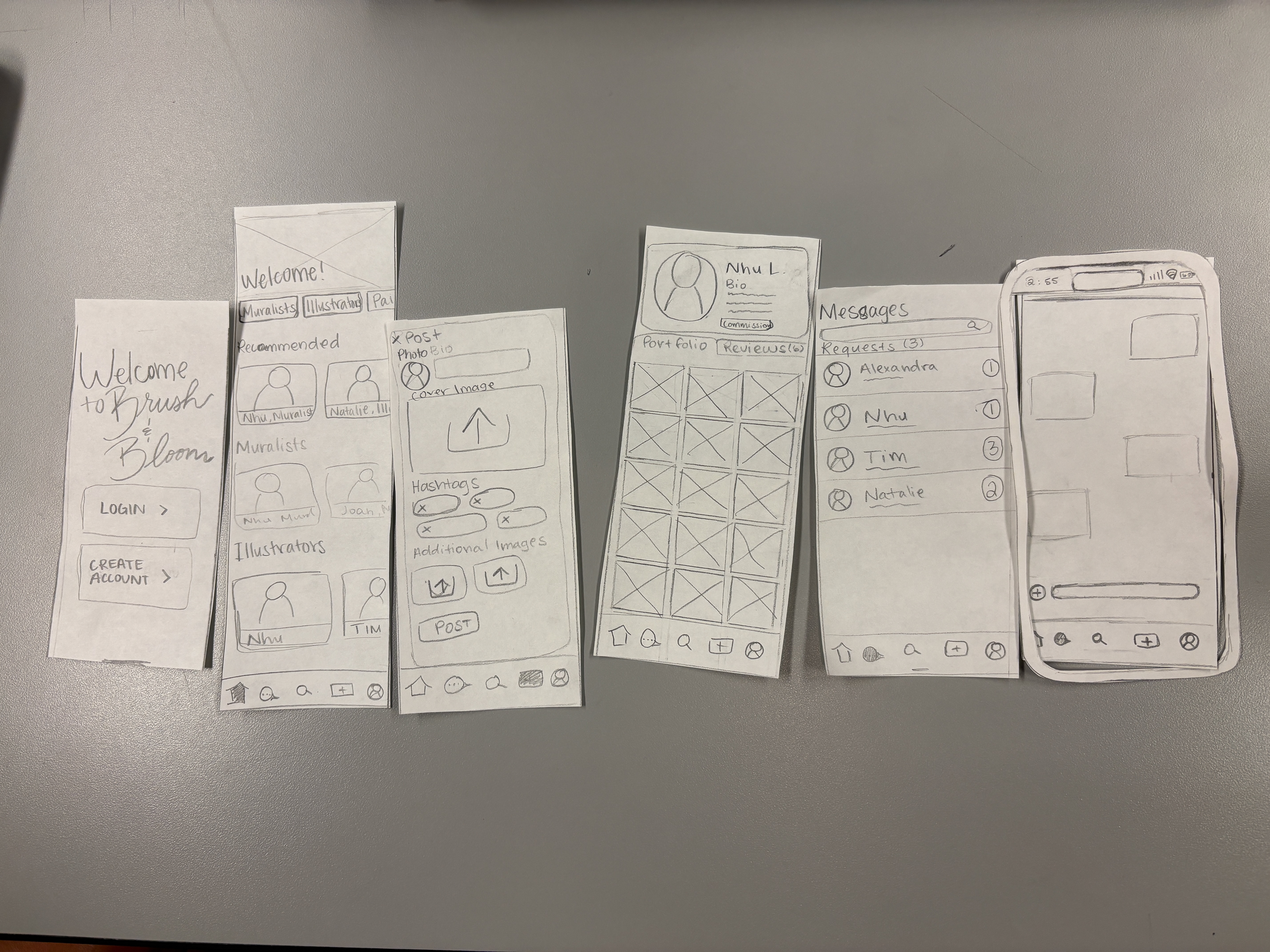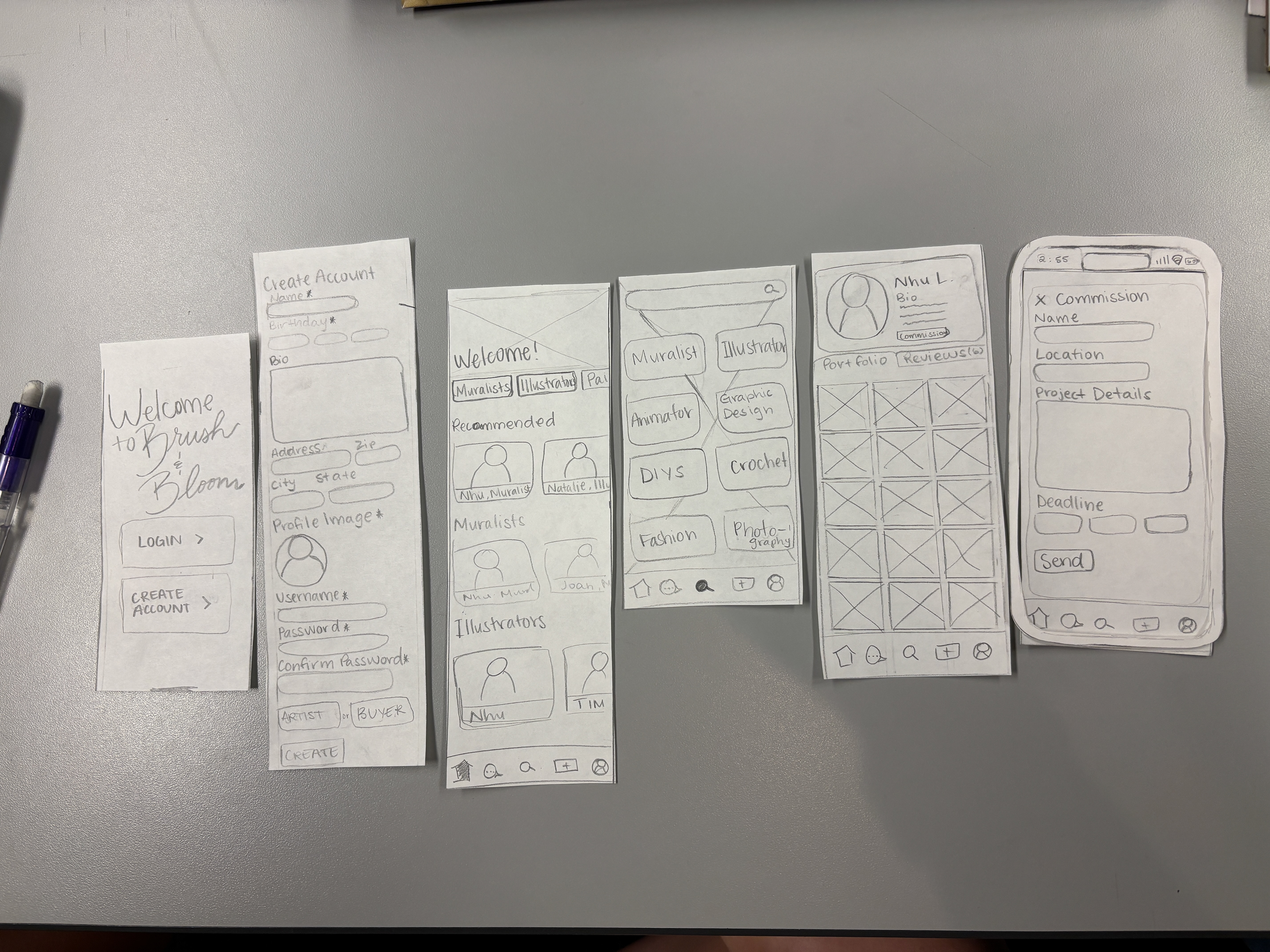 Brush & Bloom is a mobile app that connects clients with artists for custom commissions—from illustrations to murals. Unlike Etsy, Fiverr, or Instagram, which aren’t built for personalized art commissions, Brush & Bloom centers the full commission process. The app offers a space for browsing portfolios, direct communication, and secure transactions in a creative, artist-first environment.